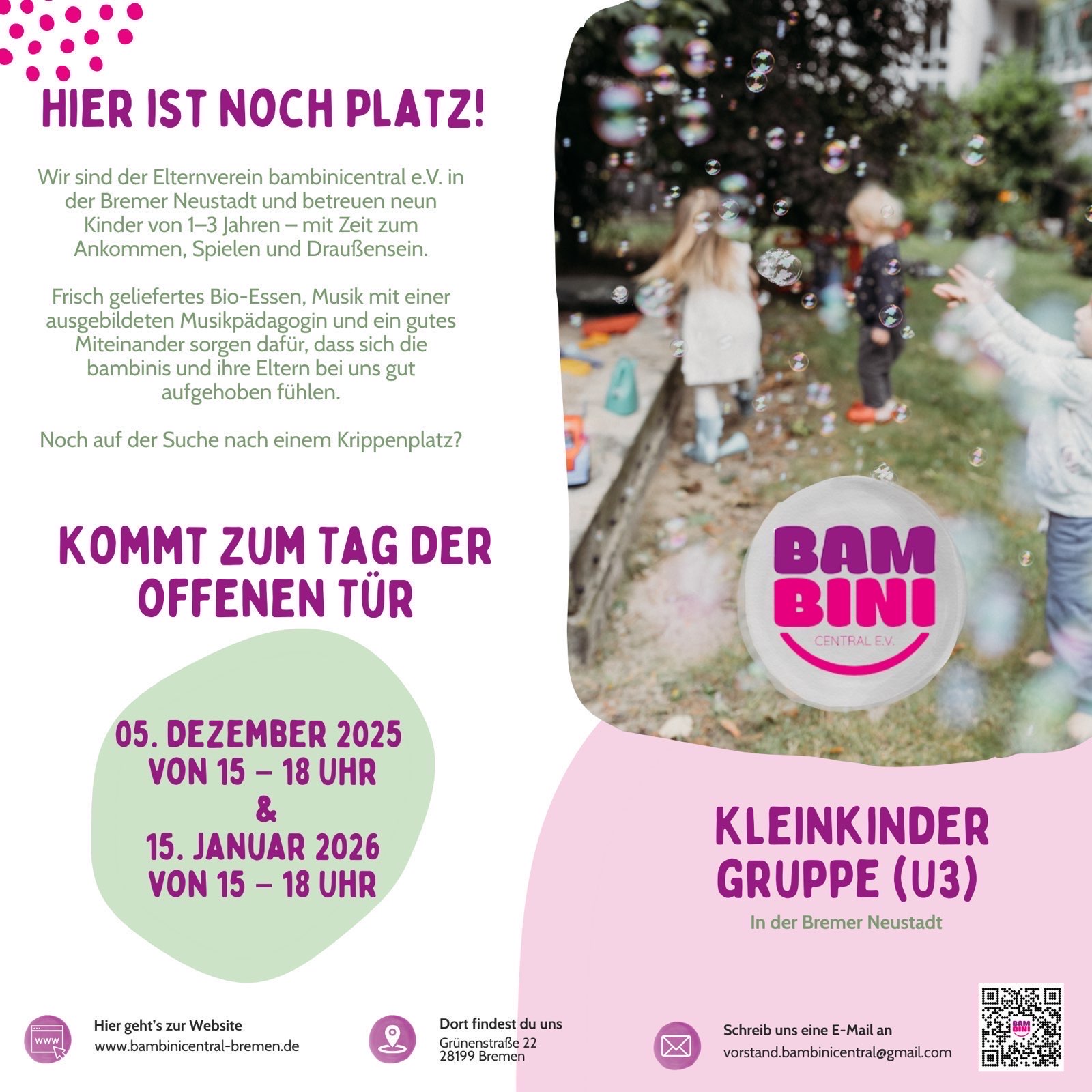 Wir sind bambinicentral e.V., eine Kleinkindgruppe in der Bremer Neustadt. Unsere neun Kinder, die Bambinis, sind zwischen 1 und 3 Jahren alt. Werktags von 8:00 bis 16:00 Uhr spielen und toben sie gemeinsam, machen regelmäßig Ausflüge zu Spielplätzen in der Umgebung oder unternehmen andere Aktivitäten und entdecken dabei gemeinsam die Welt.